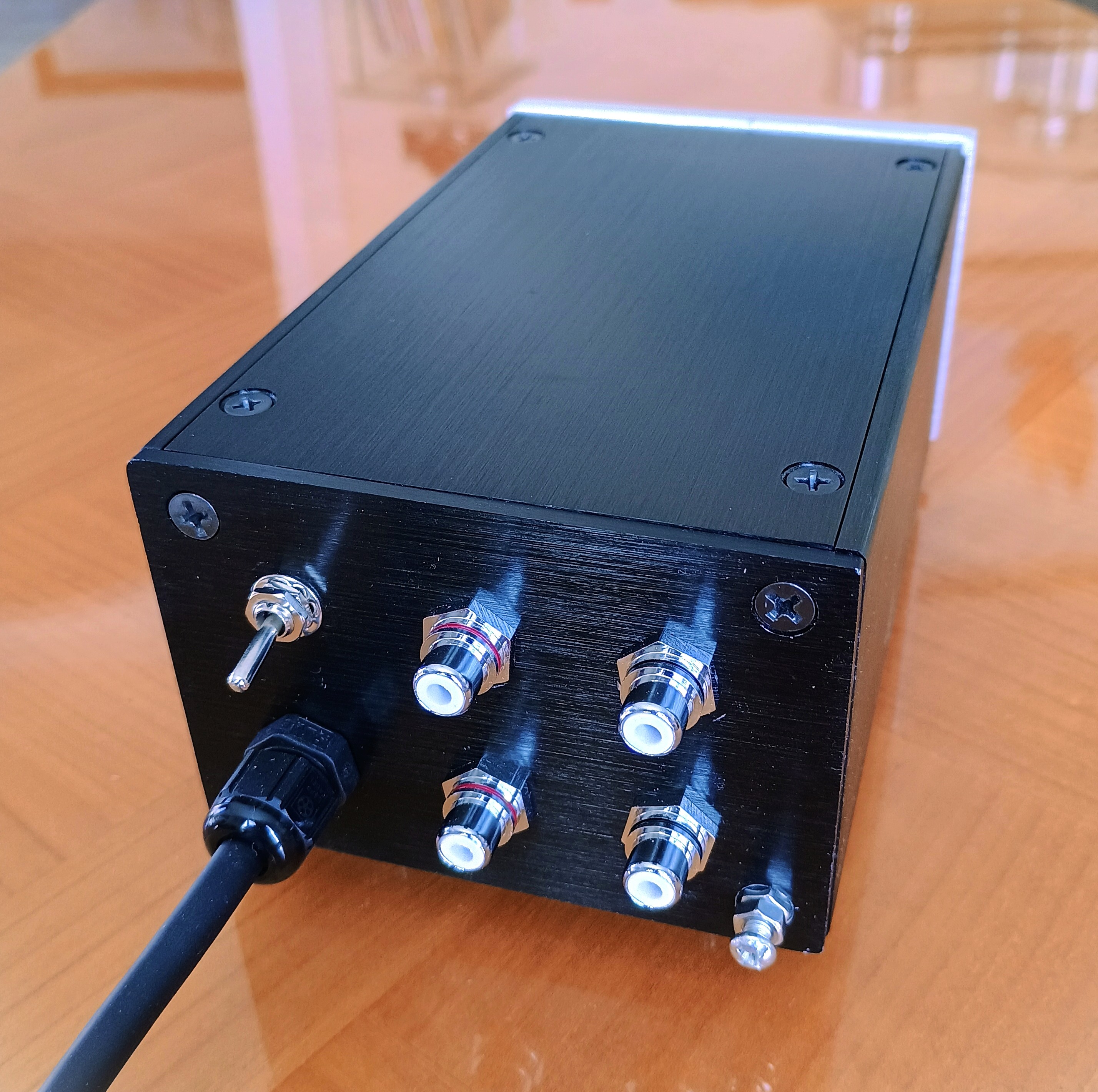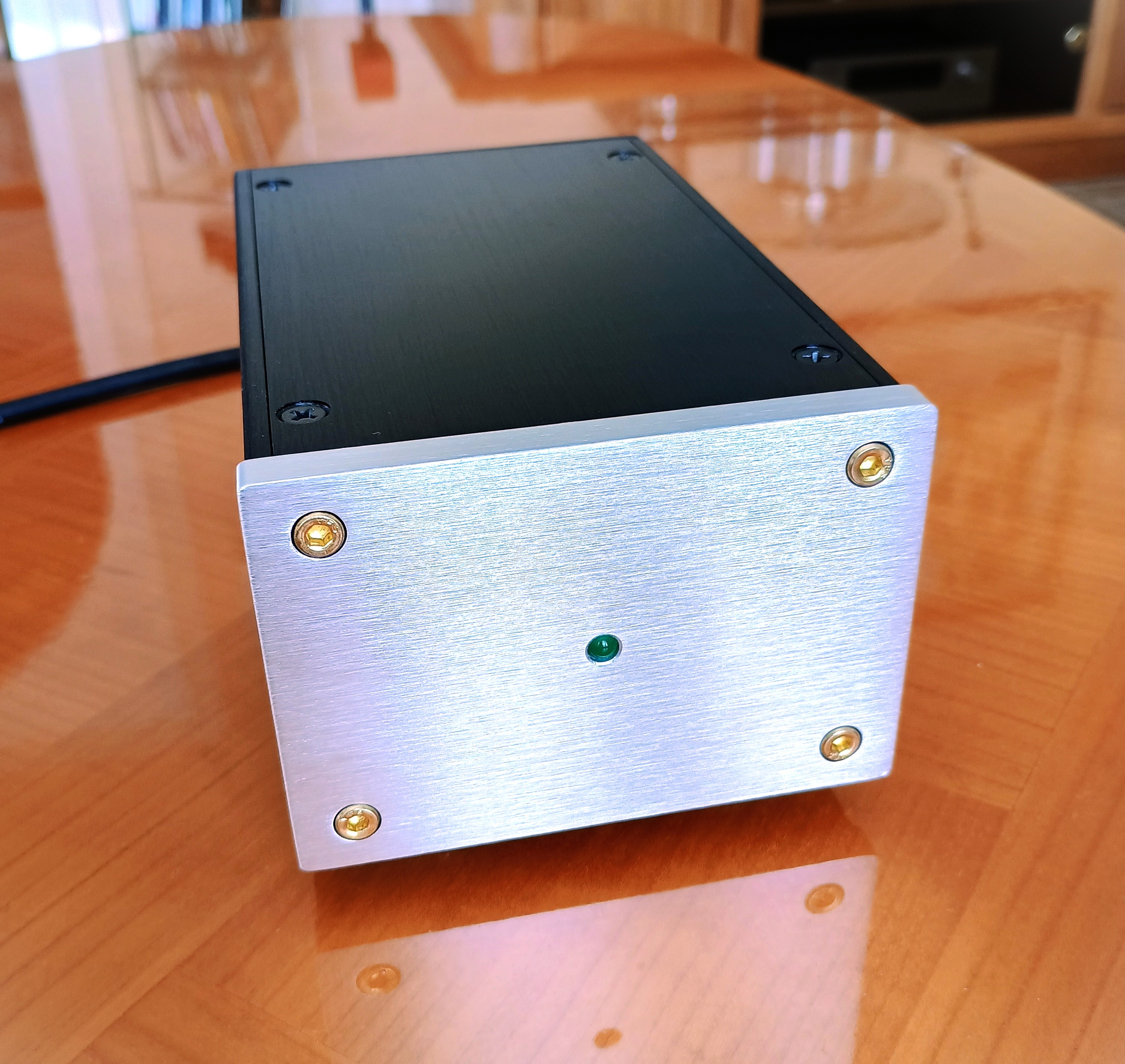 Un air de famille … … Condensateurs Mundorf (Supreme Evo et ZN) dans la cellule RIAA, étages de gain Oracle II, prises plaquées rhodium, boîtier full aluminium et … double alimentation par batteries, of course …